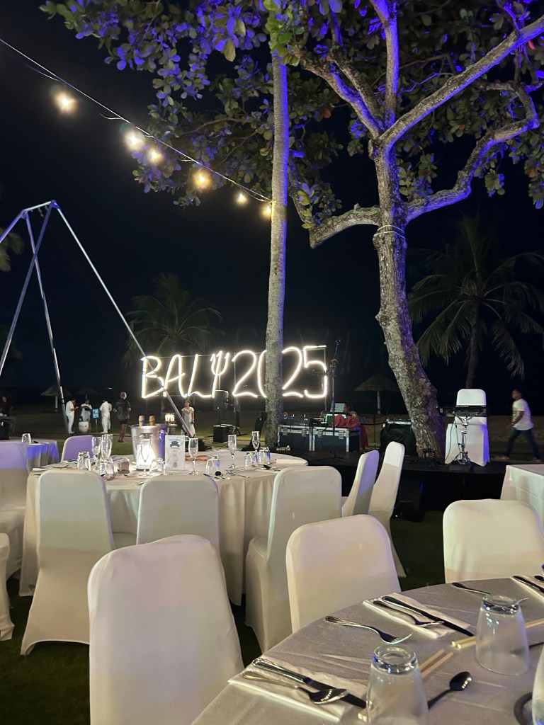 Imagine magnificent tropical gardens edging the beach, dotted with palm trees. And scattered among the trees, white cloth covered tables and chairs, set for a lavish meal. On one side a stage, on the other, chefs manning serveries groaning with prawns, fish, shellfish, meats, cheeses, breads, salads, vegetables, desserts, all there under the night sky and twinkling fairy lights.